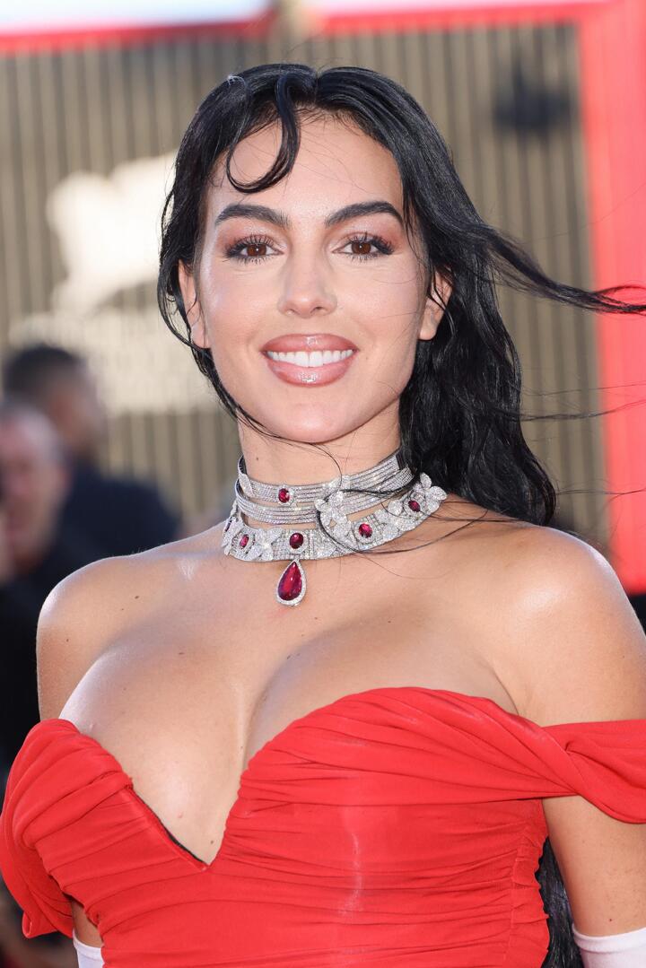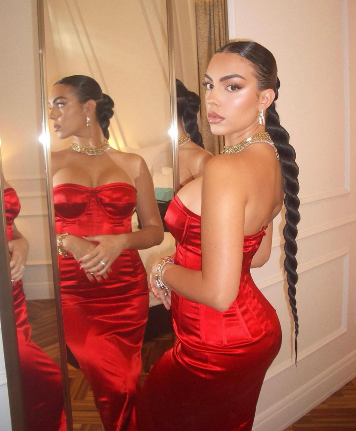 GEORGINA RODRIGUEZ has joined the no bra club as she squeezed into a red corset dress.