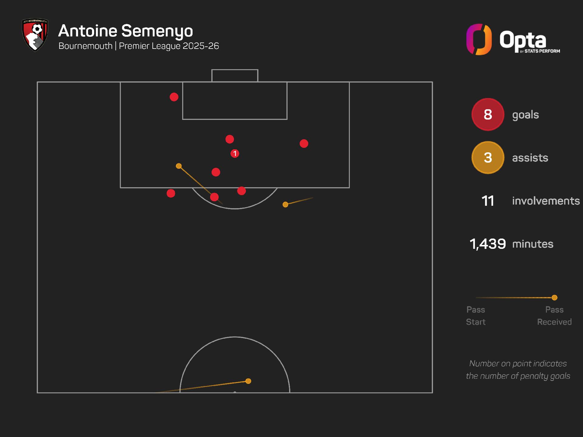 Indeed, it's the joint-most goal involvements by a Cherries player in a calendar year, along with Dominic Solanke in 2023 (15 goals, five assists), while the only other Ghanaian with 20+ goals and assists in a year was Tony Yeboah in 1995 for Leeds United (22 goals, three assists).
