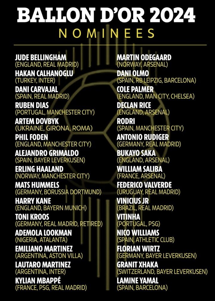 And six of the shortlist are English, with Bellingham, Foden, Palmer, Rice and Saka joined by European Golden Boot and Euro 2024 Golden Boot winner Harry Kane.