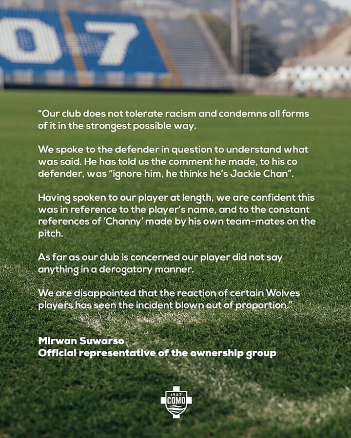 Como admitted that one of their players had called Wolves star Hwang Hee-chan 'Jackie Chan' but appeared to suggest Wolves had attached undue importance to the alleged incident.