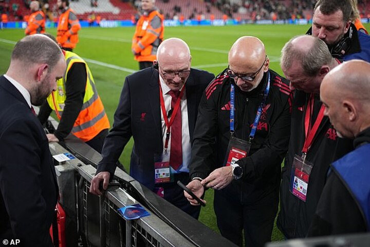 After the game, which Liverpool dominated and won 4-0 to advance to the Champions League quarter-finals, staff were seen inspecting the area where the incident occurred.