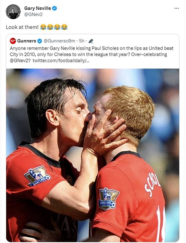 Elsewhere, another tweet from a Gunners fan said: 'Anyone remember Gary Neville kissing Paul Scholes on the lips as United beat City in 2010, only for Chelsea to win the league that year? Over-celebrating @GNev2?'