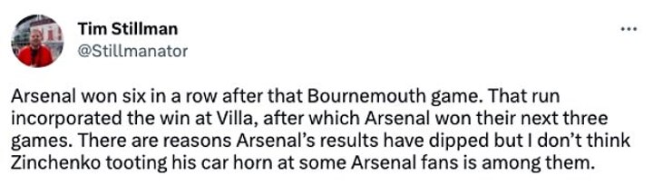 But the fan pointed out both results were amidst a run of seven straight league wins which put Mikel Arteta's side in a very strong position to clinch a first title since 2004.