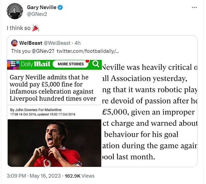 They also posted another screenshot from his playing days when Neville had criticised the FA for fining him for his passionate celebration in the game, claiming that 'they (must) want robotic players who are devoid of passion'.
