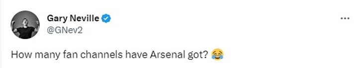 Meanwhile, Neville then added another tweet which said: 'How many fan channels have Arsenal got?', with the same emoji as he revelled in Arsenal fans' meltdown.