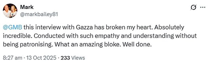 '@GMB this interview with Gazza has broken my heart,' the user started. 'Absolutely incredible. Conducted with such empathy and understanding without being patronising. What an amazing bloke. Well done.