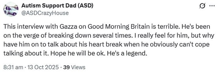 One X user wrote: 'This interview with Gazza on Good Morning Britain is terrible. He's been on the verge of breaking down several times. I really feel for him, but why have him on to talk about his heartbreak when he obviously can't cope talking about it. Hope he will be ok. He's a legend.