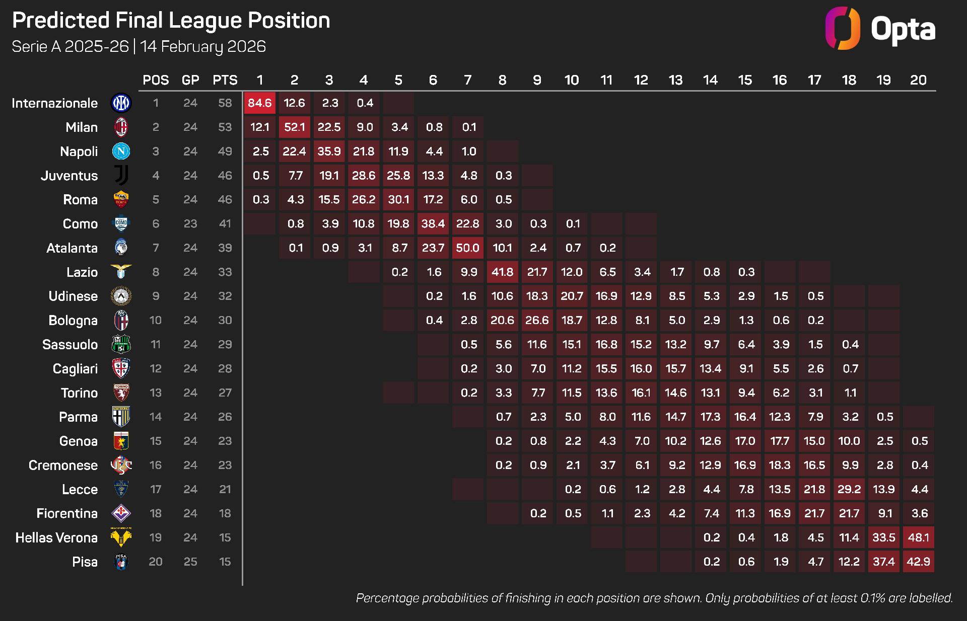 With 14 games left to play in the top-flight this season, the race for the top four is heating up, with Roma the outside bet; the Opta supercomputer gives them a 46.3% chance of finishing in the Champions League spots.