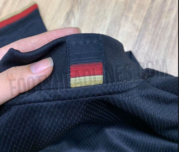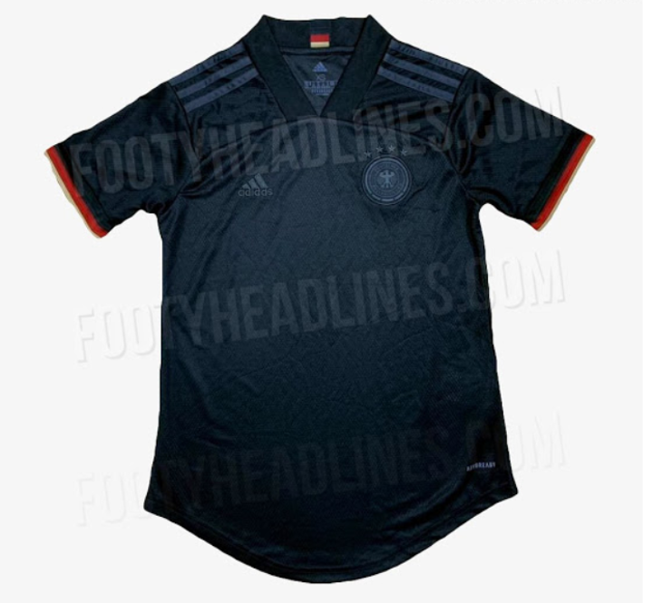 Germany's Euro 2020 away football shirt will feature a 'black / carbon' color scheme, including tonal Adidas and federation logos on the chest. The 3 Stripes on the shoulders of the shirt are also dark grey and almost merge with the base color.
