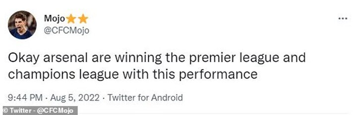 Even a rival Chelsea fan tweeted: 'Okay arsenal are winning the premier league and champions league with this performance', after their strong showing at Palace.