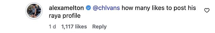 Adding weight to that theory Melton, who turned professional in 2023, then responded to the comment and said: 'How many likes to post his Raya profile'.