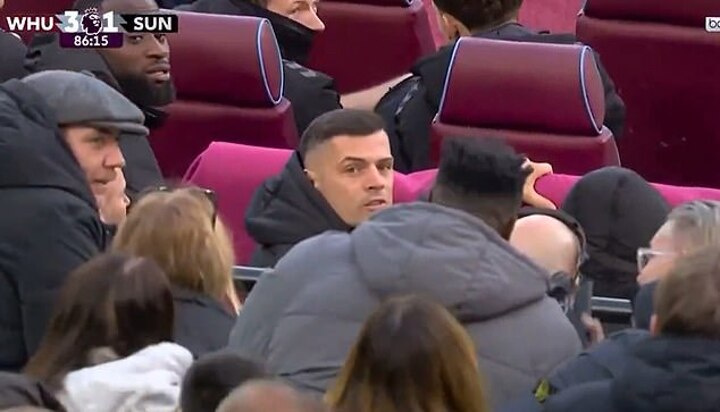 Sunderland captain Granit Xhaka appeared to be in a rage in a heated confrontation with a group of West Ham fans behind the bench at the London Stadium on Saturday.