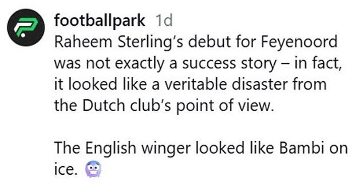 The post read: 'Raheem Sterling’s debut for Feyenoord was not exactly a success story – in fact, it looked like a veritable disaster from the Dutch club’s point of view.