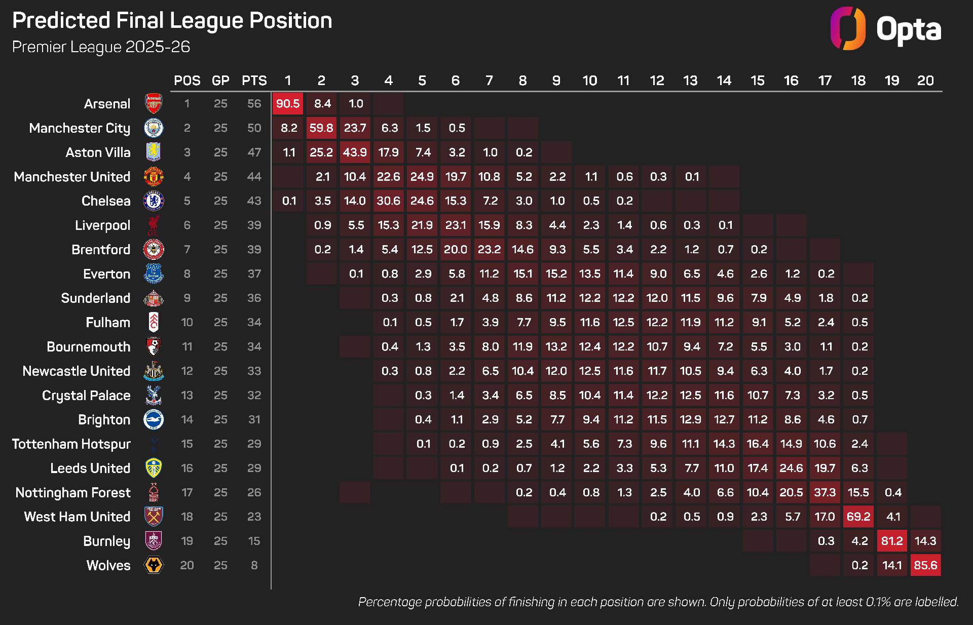 The Opta supercomputer still sees Arsenal as overwhelming favourites for the title, assigning them a 90.5% chance of glory, but City's comeback win on Merseyside boosted their hopes to 8.2%.