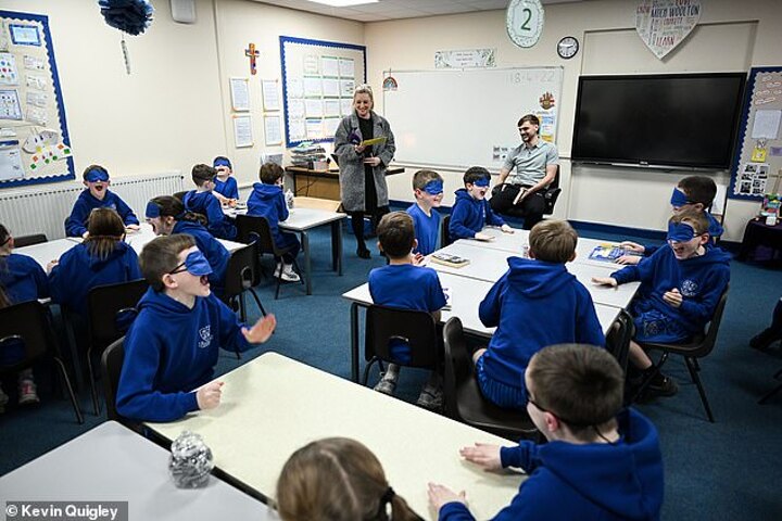 The kids are blindfolded and have to guess the identity of their ‘secret reader’ as Dewsbury-Hall makes his way slowly through a page of a Harry Potter book he has chosen. When his identity is revealed, there is classroom bedlam. An enthusiastic signing session follows, as Dewsbury-Hall makes his way from table to table talking about books, reading and a fair bit of football.