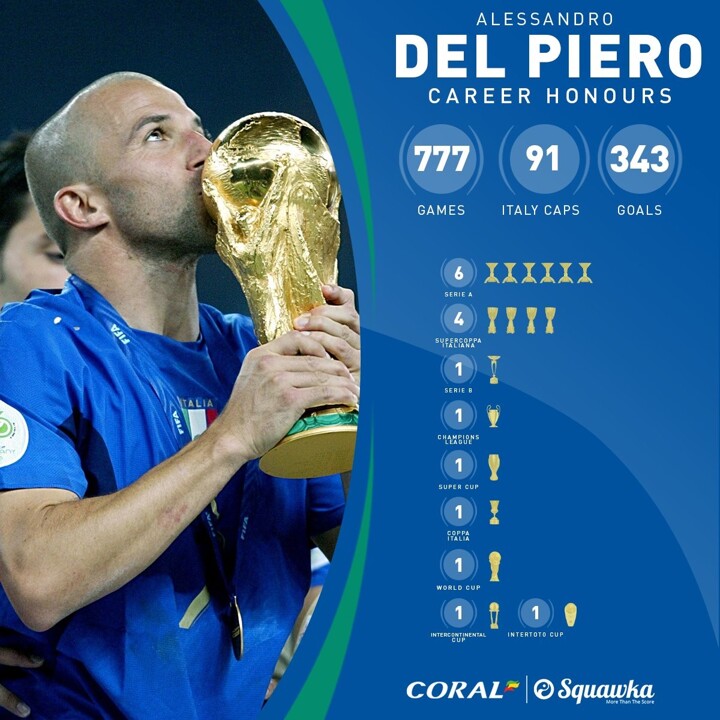 As a FIFA World Cup winner, Del Piero has the most all-time appearances for Juventus with 705 games and he also is Juventus' all-time top scorer with 290 goals.