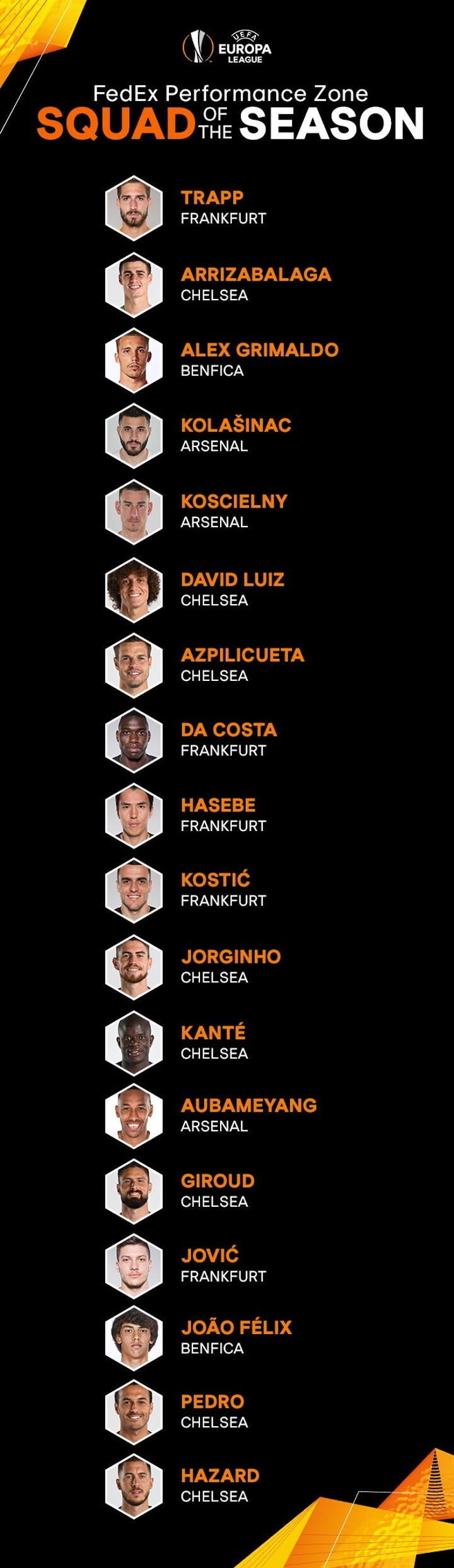 UEFA's Technical Observers select their 18-man squad from this season's UEFA Europa League including eight from Chelsea.