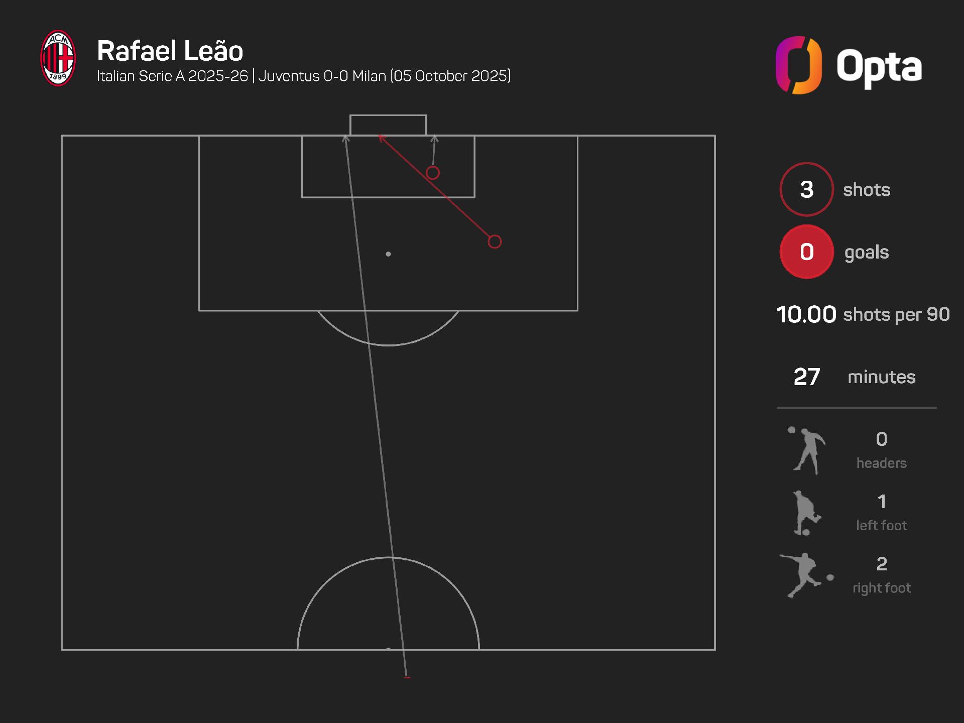 Leao came off the bench in the 63rd minute and had the joint-most shots (three), with two of those classed as 'big' chances, while contributing the second-most xG (0.4, behind Pulisic's 0.8).