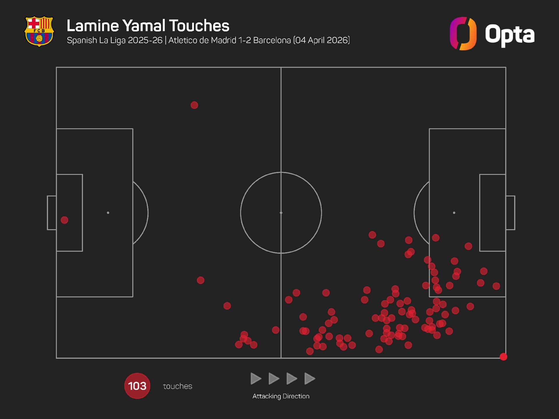 Yamal had more touches (103), shots (seven) and touches inside the area (14) of any player on the pitch, also creating a game-high five chances for his team-mates.