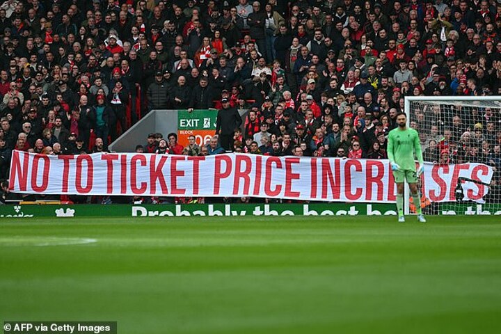 ‘No pound in the ground’ was the slogan coined by supporter group Spirit of Shankly, while Spion Kop 1906 will withdraw flags behind the goal, making an exception for the annual Hillsborough anniversary commemorations on Tuesday.