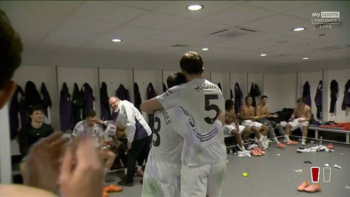 Shirts and boots were strewn across the floor while several players clapped and laughed around the benches. Bruno Fernandes and Maguire were at the centre of the celebrations, sharing a handshake and a brief embrace as teammates applauded.