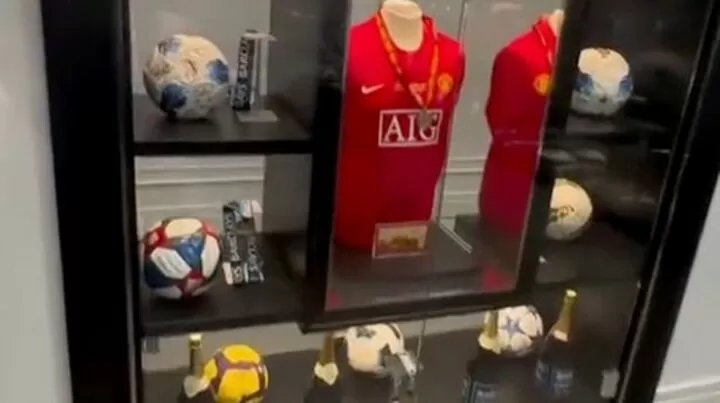 The central cabinet, meanwhile, shows off Rooney's 2008 Champions League jersey, and his winner's medal is adorned around the neck of it. There are also various match balls, more man of the match bottles of champagne, and miniature replicas of the trophies he won throughout the course of his career.