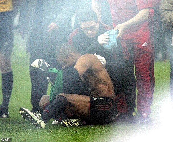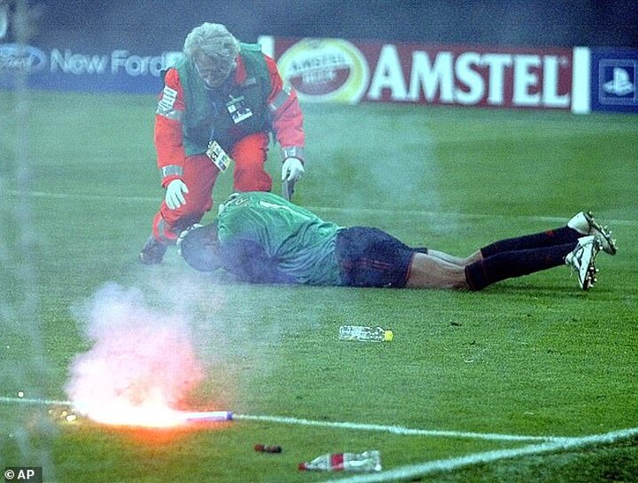 A hail of projectiles came down from the Ultras including several flares and fireworks, one of which hit Dida on the shoulder.