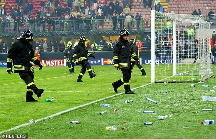 As smoke and fire rained down from the stands, the decision was taken to abandon the match with 18 minutes left to play. With Milan leading 3-0 on aggregate at the time, they were heading through but the Inter fans' actions brought widespread condemnation.