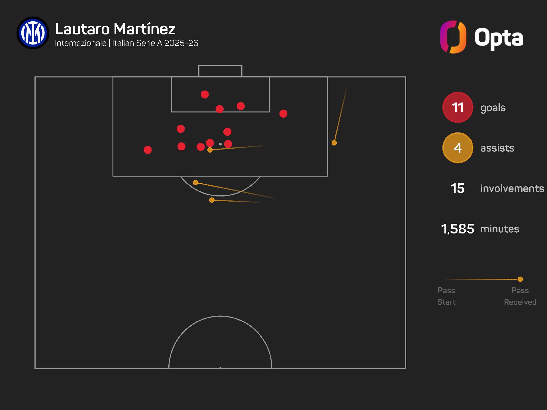 Martinez scored the only goal as Inter defeated Udinese 1-0 in their last Serie A outing. He has been involved in 15 goals in this Serie A season (11 goals, four assists), becoming the first player to record at least 15 in each of the last seven seasons in the competition.