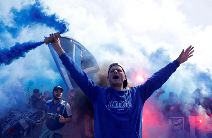 Fans set off blue flares and waved flags on the team's arrival at Portman Road.