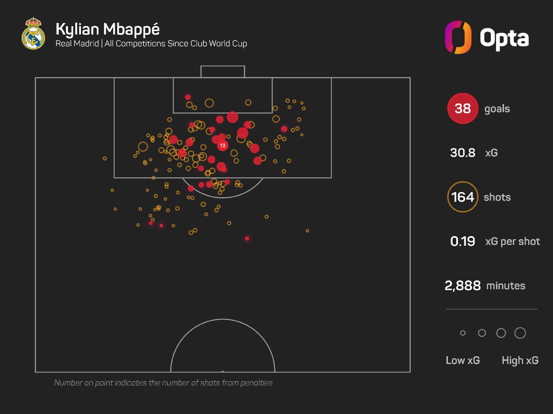 Despite missing 10 games in total since last summer's Club World Cup, Mbappe is Madrid's top scorer in all competitions, netting 38 times in 35 appearances and averaging a goal every 76 minutes.