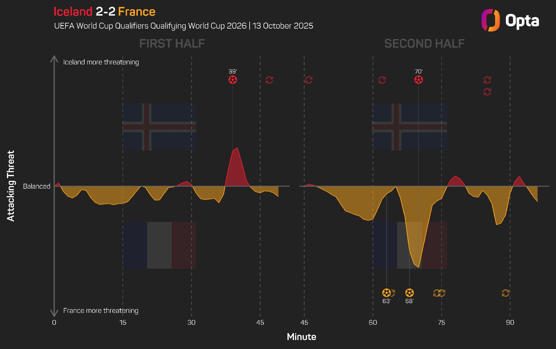 France dominated in Reykjavik, having 20 shots, nine of which were on target as they accumulated 1.8 expected goals (xG).