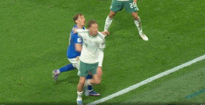 45' Matteo Retegui tries to lob the ball over Pierce Charles, but gets it wrong