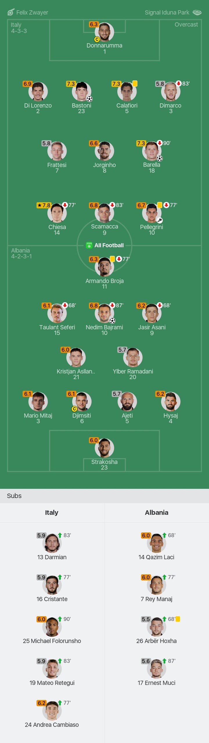 We bring you the player ratings for Italy vs Albania as Chiesa becomes Man of the Match with a rating of 7.8.