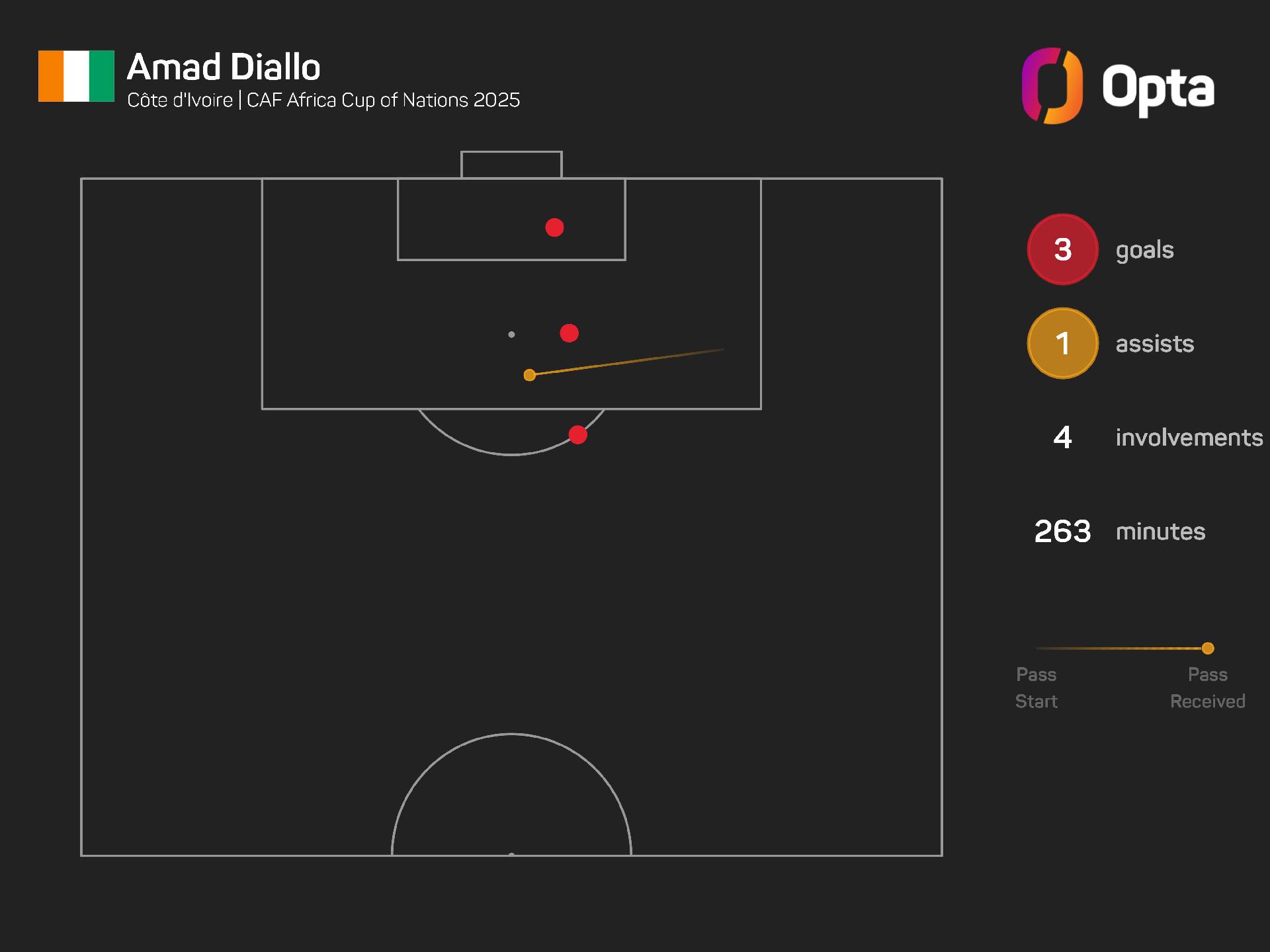 Heading into the last eight, only Nigeria's Ademola Lookman had more goal involvements (seven), while no player was involved in more shots than Amad (24 – 15 shots, nine chances created).