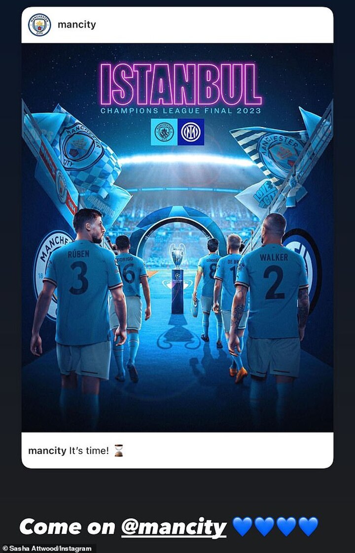 Model Sasha, 27, took to Instagram to repost Man City's promotional poster ahead of the game, captioning the image: 'Come on @mancity,' along with four blue heart emojis.