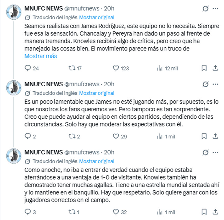 The account MNUFC News shared a harsh reflection on James Rodriguez's present at the MLS team. "Let's be realistic with James Rodriguez, this team doesn't need him. It always felt that way. Chancalay and Pereyra have stepped up tremendously. Knowles will get some criticism, but I think he's handled things well. The move seems more like a PR stunt for the club, and it's working," he said