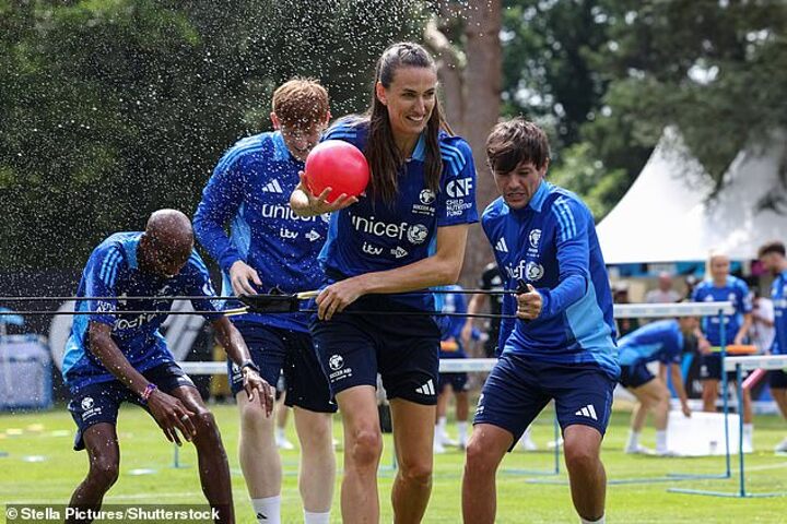 He wore a huge smile and was regularly laughing as he linked up with David James, Paddy McGuinness, Jill Scott, Jermain Defoe, and Louis Tomlinson among others.