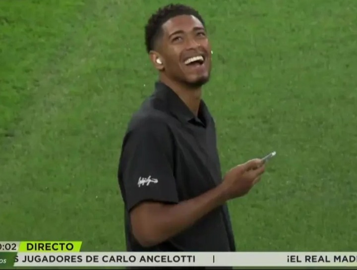 Yet just hours ahead of kick-off, Bellingham was filmed walking around on the Bernabeu turf with his earphones in.