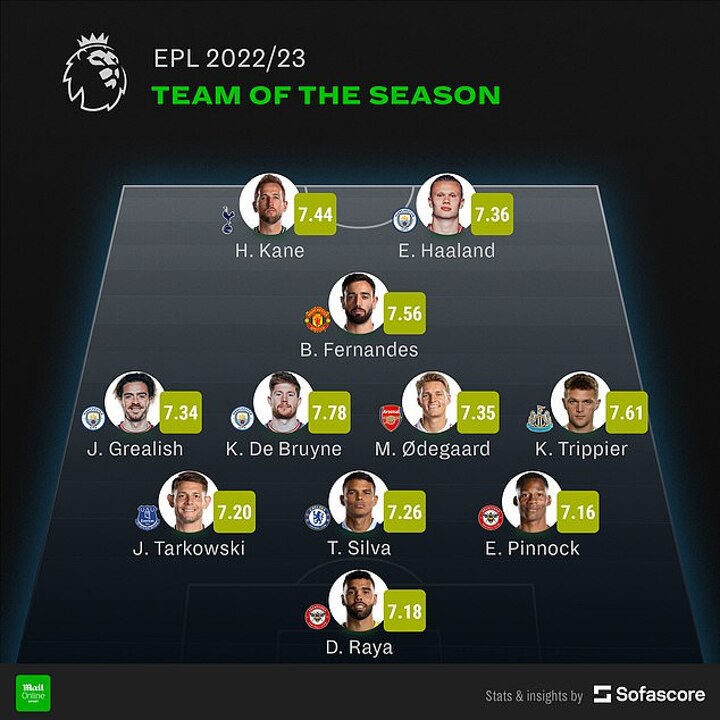 Erling Haaland took pride of place in the team named by Sofascore, after getting the Golden Boot with his impressive goalscoring in his debut Man City season.