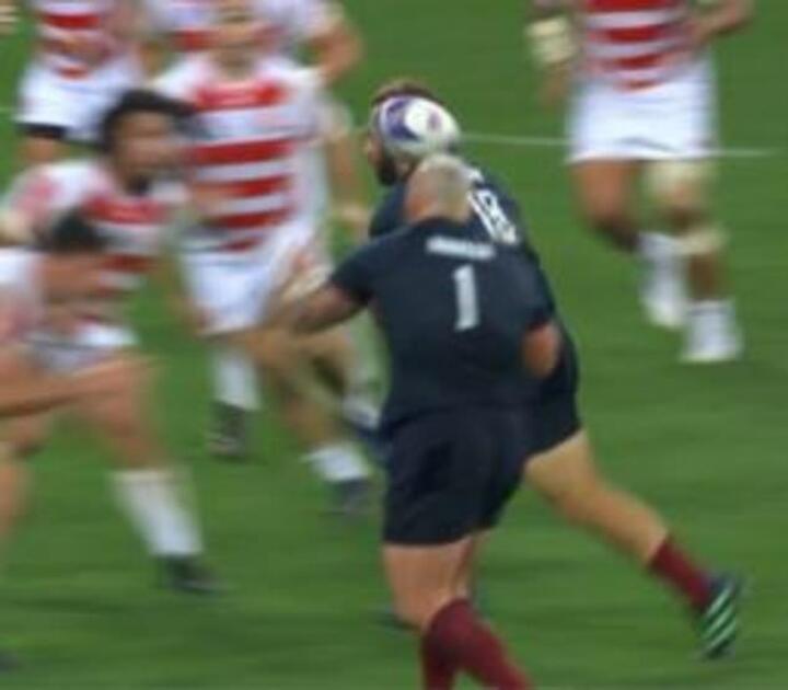 The deflection put Lawes clean through a few yards out who duly dotted down, with the referee unable to award a Japan scrum for a knock-on if the ball comes off a player's head.