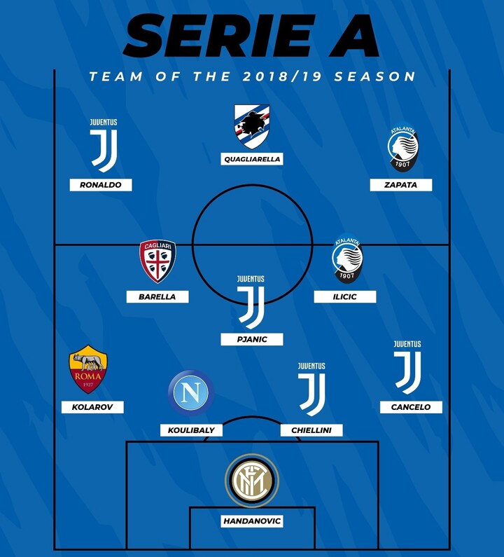 Best XI: Handanovic (Inter); Kolarov (Roma), Chiellini (Juventus), Koulibaly (Napoli), Cancelo (Juventus*); Pjanic (Juventus), Ilicic (Atalanta), Barella (Cagliari*); Quagliarella (Sampdoria), Ronaldo (Juventus), Zapata (Atalanta)