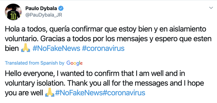Juventus have denied their forward Paulo Dybala was positive in coronavirus test in a recent note to Italian media Ansa.