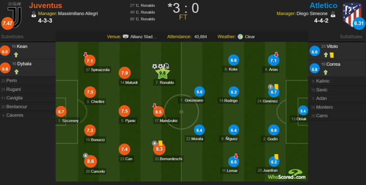 The excellent Federico Bernardeschi then drove into the penalty area and was brought down by Angel Correa, with Ronaldo stepping up with four minutes to go to convert the spot-kick and down Atletico Madrid yet again.