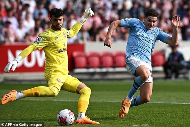 Goalkeeper David Raya made no attempt to pass out from the back as he launched long balls towards Ivan Toney, stripping City of the chance to press high. Toney was a giant in the air, the underrated Bryan Mbeumo used his pace to break beyond the City defence, and Frank Onyeka broke forward from midfield in case there was a second ball to be won.