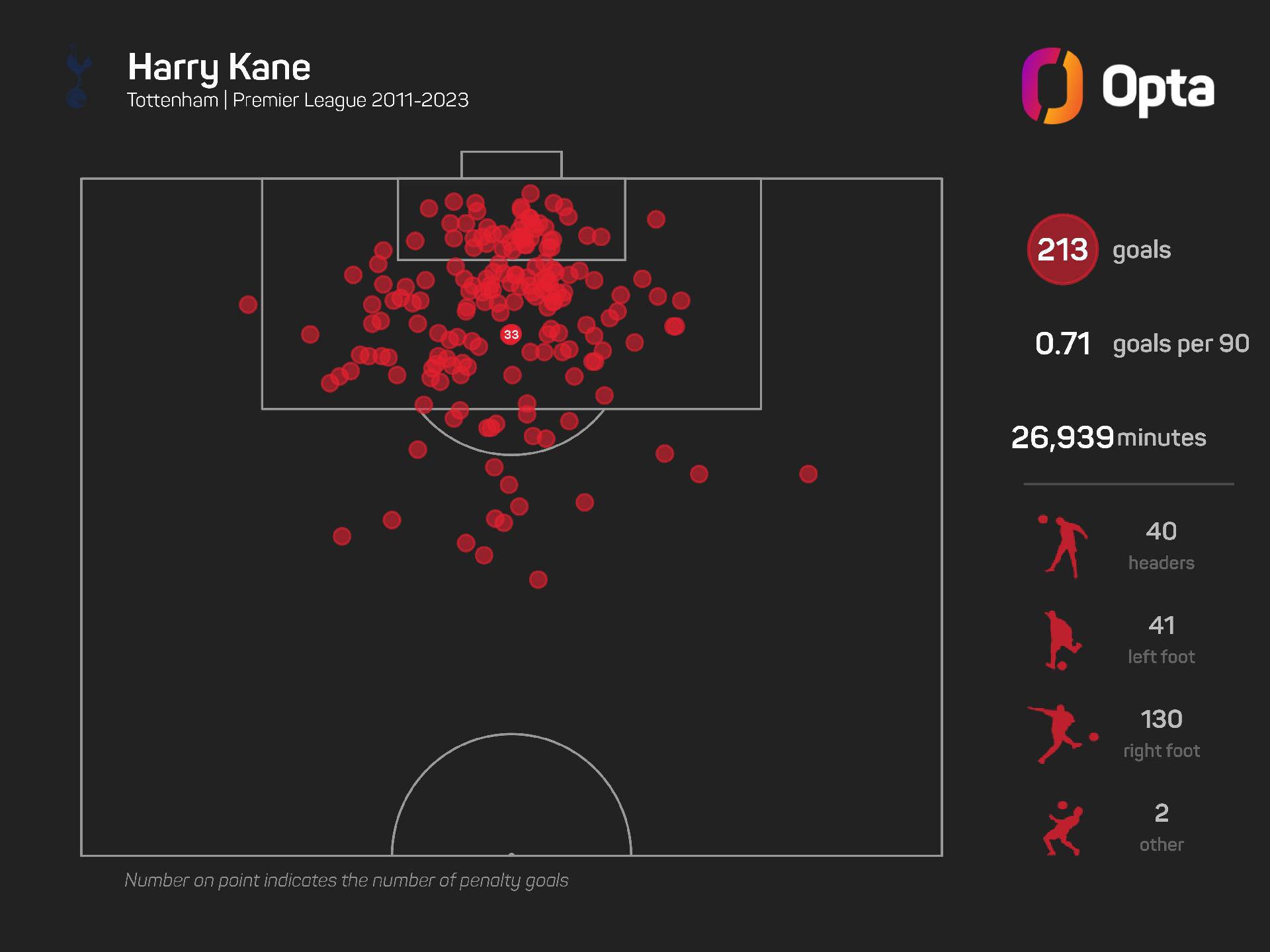 Overall, the England captain has scored 190 of his goals with his favoured right foot, with a further 54 coming from his left – just one fewer than with his head (55).