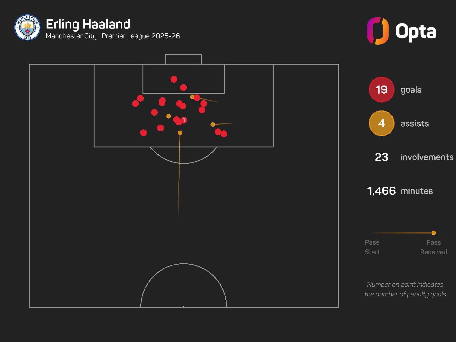 Haaland has now scored 38 goals for club and country in 2025-26, while he has taken his overall Premier League tally to 104, moving him above Cristiano Ronaldo (103) in the all-time list.