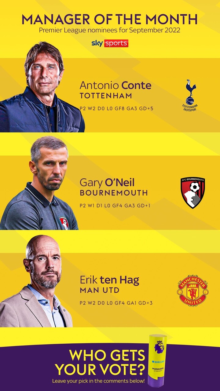 EPL nominees for September’s Manager of the Month: Conte & Ten Hag in