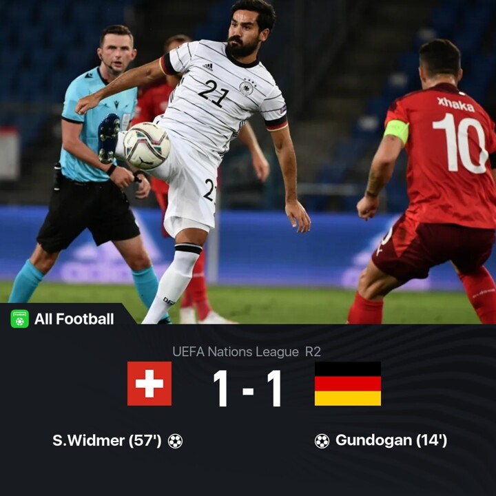 Germany were held to another 1-1 draw in their UEFA Nations League Group A4 match away in Switzerland after Ilkay Gündogan’s first half strike was cancelled out by Silvan Widmer.