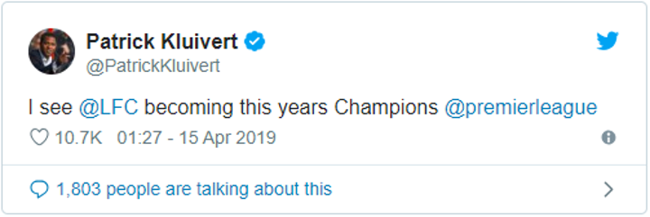 Former Barcelona and Newcastle United striker Patrick Kluivert has predicted on Twitter that Liverpool will win the Premier League title this season.